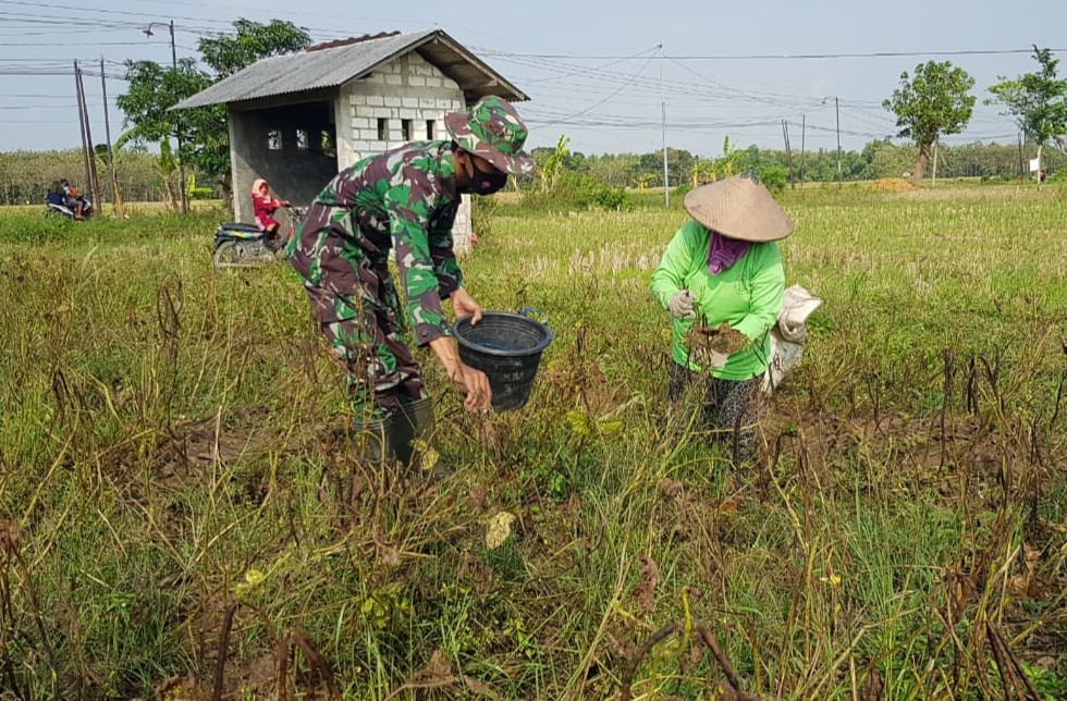 Pati – Tertihat pagi itu Serda Sukarji sedang memanen buah tanaman kacang dilahan salah satu warga Dukuh Pandahan, Desa Tamansari, Kecamatan Jaken, Kabupaten Pati. Tidak seperti biasanya, batang tanaman kacang hijau tersebut daunnya sudah mengering dan tinggal buah kacang hijau yang tersisa.
