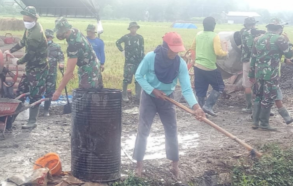 Pati – Dalam kegiatan pengerjaan sasaran fisik TMMD Reguler ke-111 Kodim 0718/Pati di Desa Tamansari, Kecamatan Jaken, Kabupaten Pati, ada yang terlihat aneh. Nampak ada salah satu warga masyarakat yang tidak mengenakan pelindung kaki ketika bekerja di lokasi pengadukan material cor, Sabtu (26/6/2021).