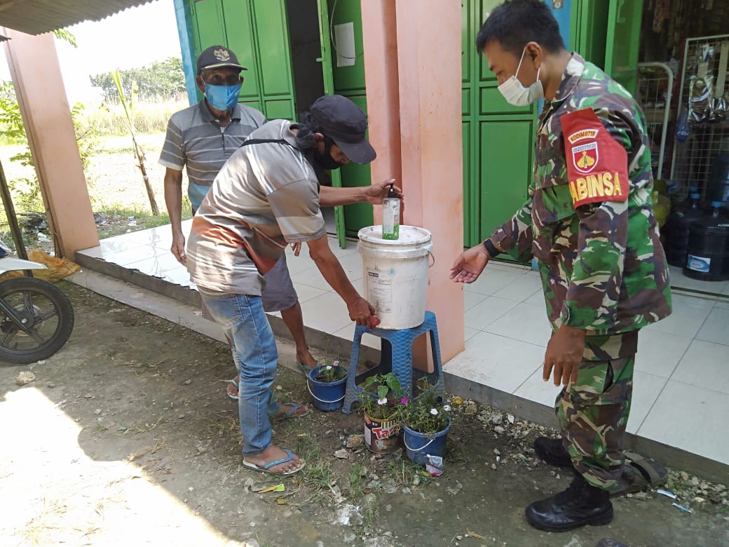 Anggota Satgas TMMD ke 111 Kodim 0718/Pati Serda Muslimin melaksanakan penertiban protokol kesehatan giat bansos lansia di balai Desa Rt.04 Rw.01 Tamansari.