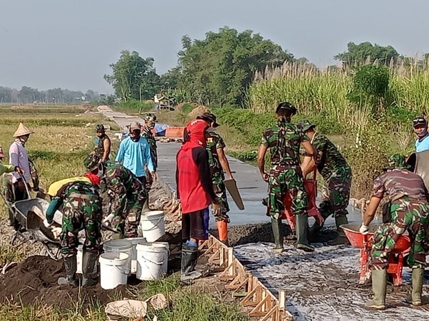 PATI – Satuan Tugas (Satgas) TNI Manunggal Membangun Desa (TMMD) Kodim 0718/Pati Reguler ke-111 tahun 2021, di Desa Tamansari, Kecamatan Jaken, Kabupaten Pati, terus bersemangat untuk merampungkan pembangunan jalan rabat beton.