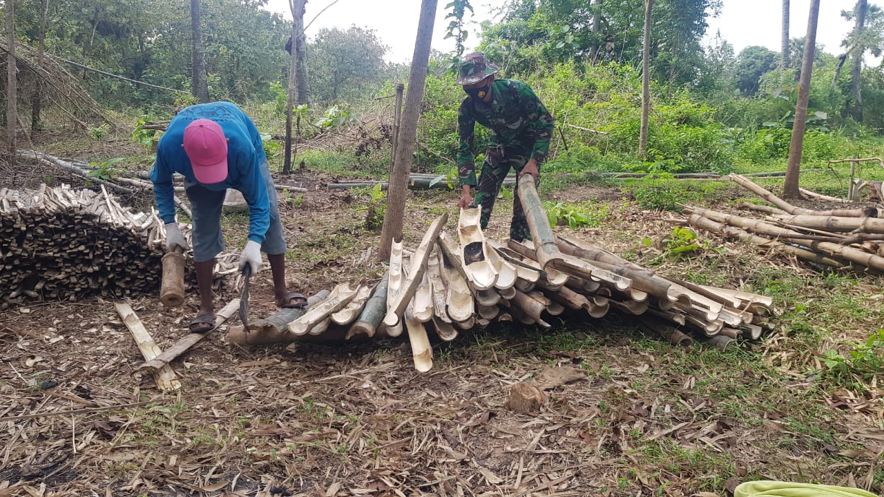 Pada kesempatan istirahat bekerja anggota satgas membatu Yatno diladang miliknya, yang sedang memotong bambu rencananya akan dibuat sebagai lanjaran pare dikebunya. Serda Warso yang turut membatu pun langsung ikut membelah kayu dan setelah itu akan dihaluskan satu persatu.
