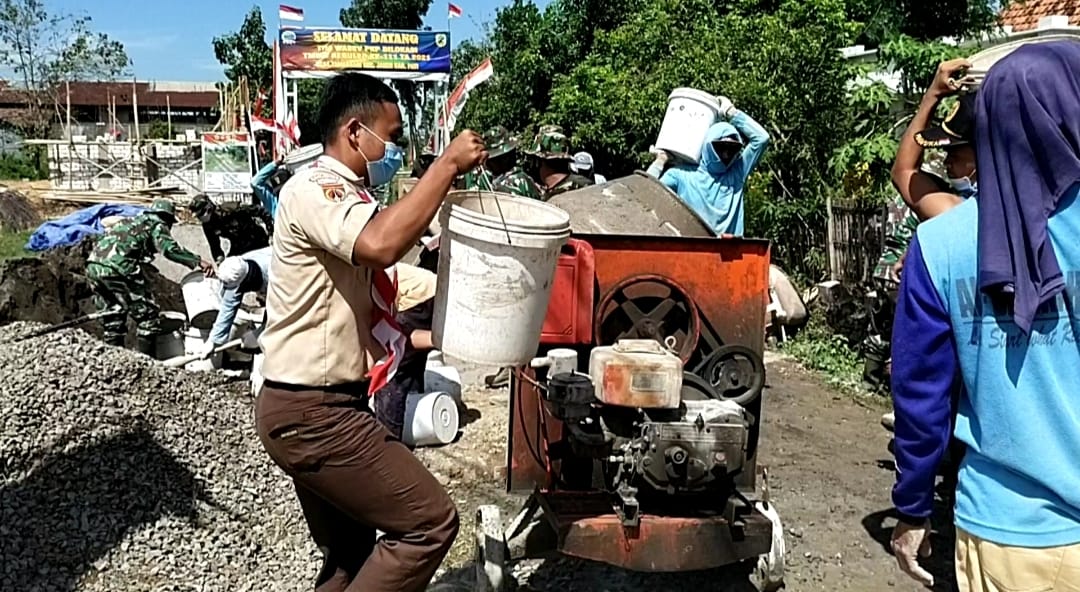 Pati-Seakan tidak mau kalah dengan elemen masyarakat yang lainnya, gerakan Pramuka dari kwartir cabang kabupaten Pati juga turut dalam kegiatan betonisasi jalan dalam program TMMD Reguler 111 Kodim Pati. Selasa,(06/07/2021).