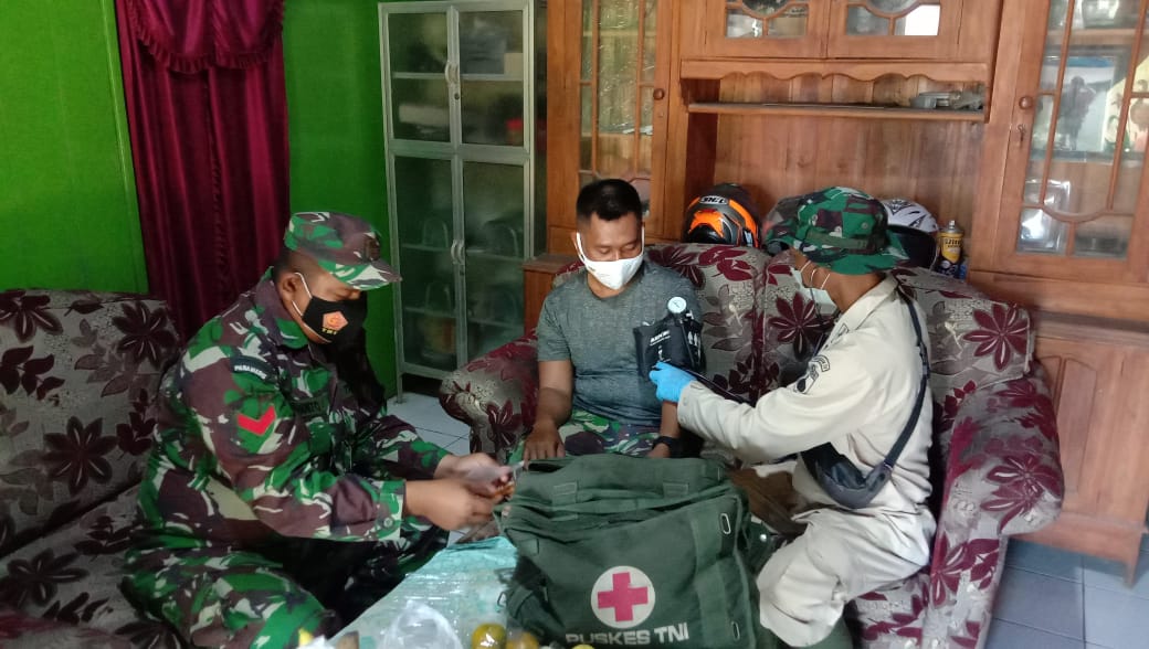 Pati – Anggota Satuan Tugas TNI Manunggal Membangun Desa (TMMD) Reguler 111 TA.2021 Kodim 0718/Pati dilokasi tempat tinggal SSK TMMD rutin diadakan pemeriksaan kesehatan. Selasa (13/7/2021)