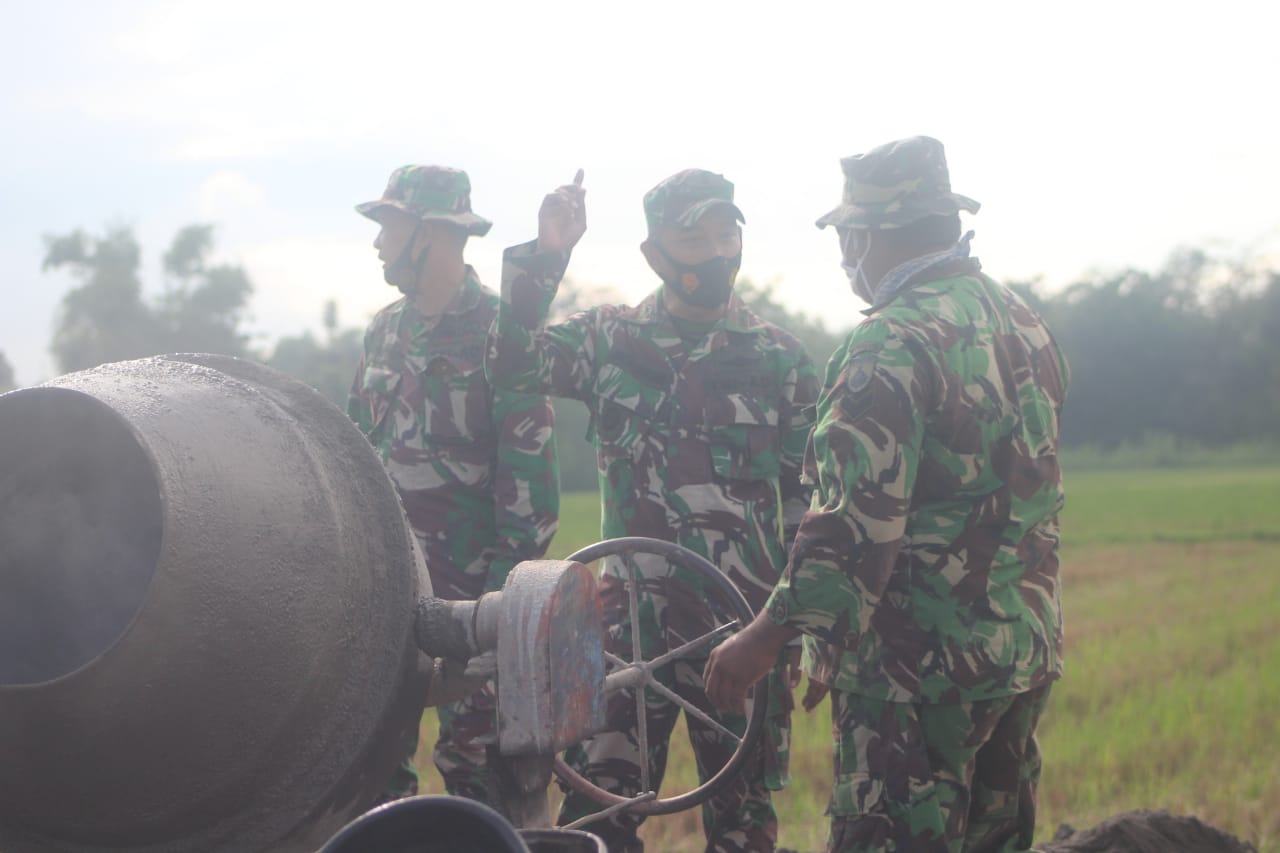 Pati-Meninjau lokasi betonisasi jalan di area persawahan desa Tamansari yang membentang luas, Mayor Inf Much. Sholihin kagum kepada Sertu Budi Waluyo salah satu anggota satgas TMMD Reg. 111 Kodim Pati yang sangat trampil mnegoperasikan mesin molen pengaduk semen pasir dan batu split.Sabtu,(26/06/2021).
