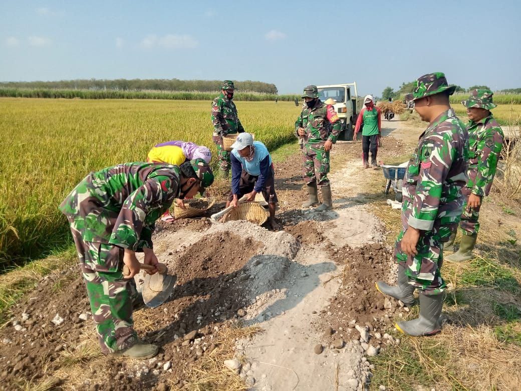 PATI – Program TNI Manunggal Membangun Desa (TMMD) Reguler ke 111 TA.2021.di Desa Tamansari, Kecamatan Jaken, saat ini material Pasir urug sudah di drop ke lokasi TMMD untuk meratakan jalan yang bergelombang, Senin (14/06/2021).