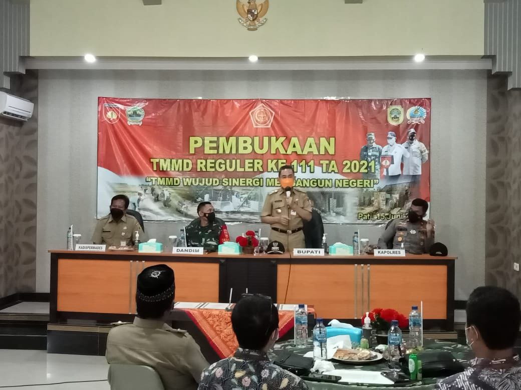 Hal tersebut ditegaskan Bupati Pati Haryanto SH,MH,M.S.I saat pembukaan TMMD Reg 111 di Balai Desa Tamansari, Kecamatan Jaken, Kabupaten Pati, Kodim 0718/Pati, Selasa (15/06/2021). Menurutnya, pelaksanaan pembukaan kegiatan TMMD kali ini dilaksanakan dalam suasana yang sangat berbeda, karena masih dalam suasana pandemi Covid-19. Kegiatan TMMD pun harus tetap berpedoman pada protokol kesehatan guna memutus mata rantai penyebaran Covid-19.