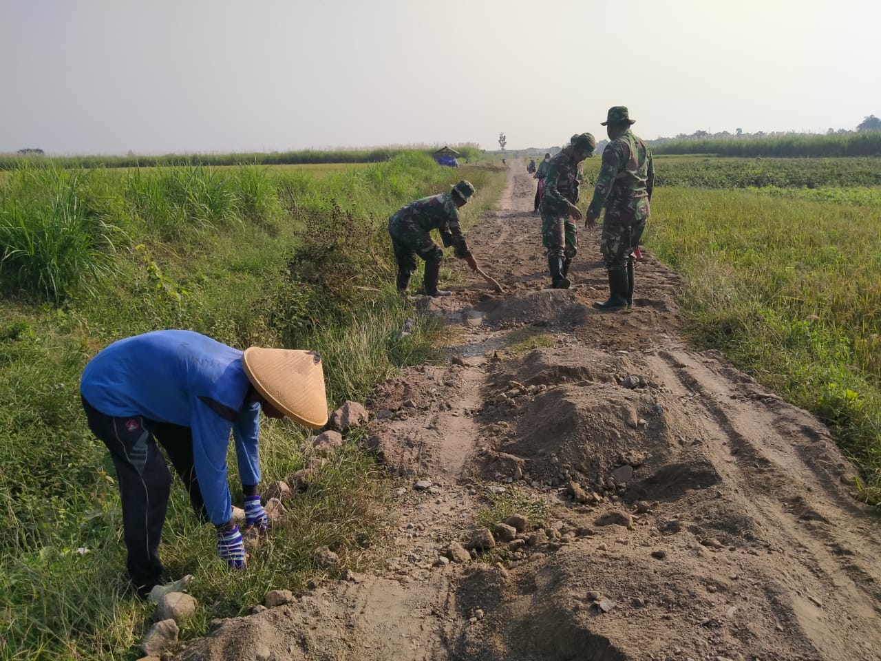 Sebagian dari anggota TNI Kodim 0718/Pati, satgas Pra TMMD menggunakan cangkul untuk menarik tanah kedepan, kanan dan kiri, sehingga tanah menjadi rata.