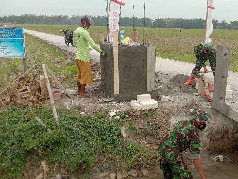 Pati – TNI Manunggal Membangun Desa (TMMD) Reguler Ke-111 Kodim 0718/Pati TA.2021, warga masyarakat desa bersama anggota Satgas TMMD masih melanjutkan pembangunan tugu prasasti TMMD Reguler 111 yang baru mencapai 45 persen.