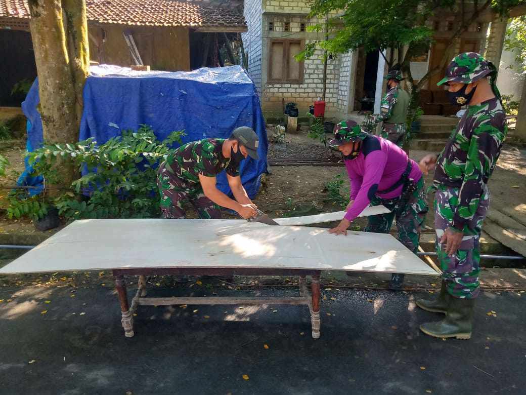 Tampak para anggota satgas sedang memotong Triplek yang akan digunakan sebagai papan untuk menutup cor beton pada pondasi rumah milik Sulasih.