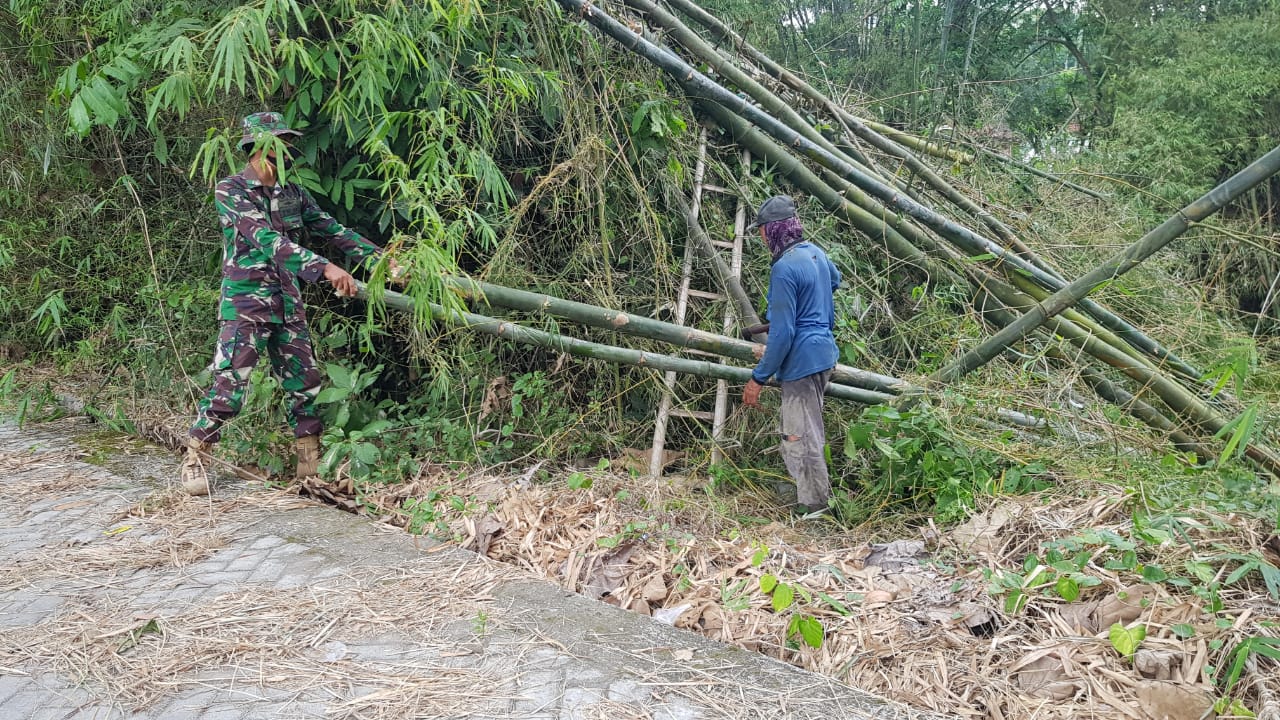 Nampak terlihat TNI bersama warga bergotong-royong menebang bambu yang akan di gunakan pada rehab rumah RTLH, rencananya akan dibuat kerangka atap sebagai reng.