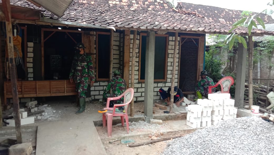Pati – TNI Manunggal Membangun Desa (TMMD) Reguler Ke-111 Kodim 0718/Pati di sasaran fisik rehab Rumah Tidak Layak Huni (RTLH) pengerjaannya dilakukan secara bergiliran dikarenakan ketersediaan tukang diwilayah desa Tamansari, kecamatan Jaken, Kabupaten Pati. Senin (28/6/2021)