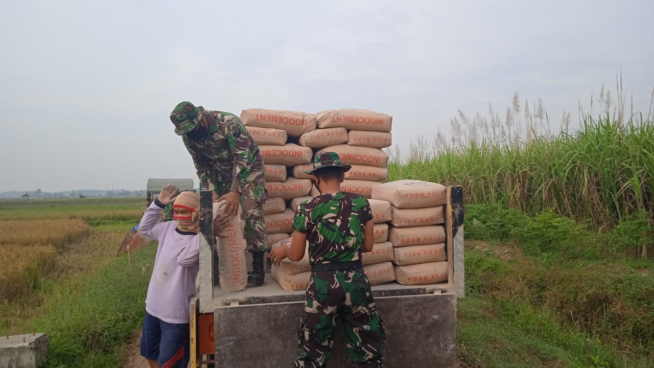 Satgas TMMD Reguler ke 111 beserta warga gotong-royong dalam penurunan material semen.