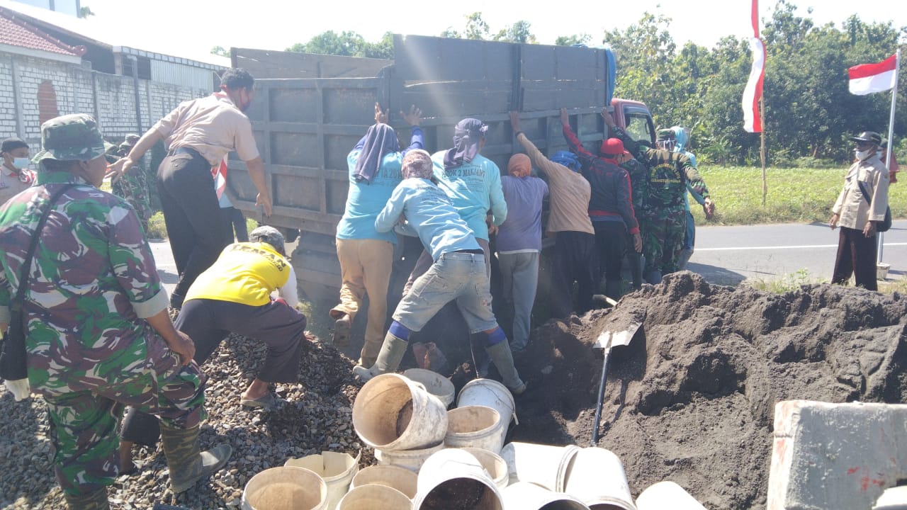 Pati – Dump truck pengangkut material pengecoran jalan TMMD Reguler-111 Kodim 0718/Pati terjebak di parit kecil tanahnya gembur, sejumlah anggota Satgas TMMD dan warga membantu dorong, Rabu (07/07/2021).