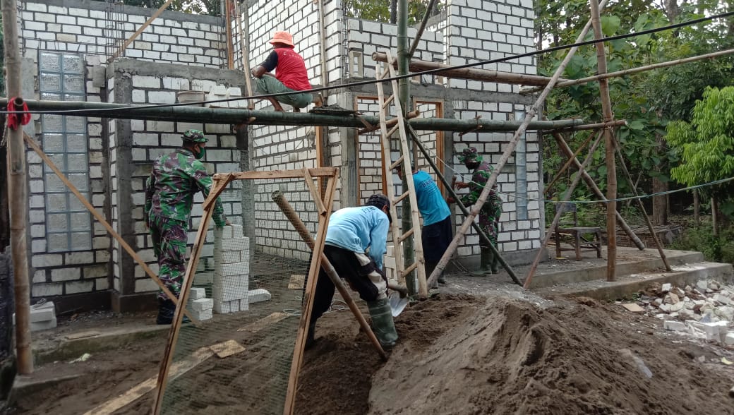 Anggota Satgas TMMD Kodim 0718/Pati bersama warga masyarakat desa Tamansari terlihat masih proses tahap pemasangan batu bata putih rumah milik Suyat (37) salah satu warga yang menerima bantuan rehab RTLH di Program TMMD Reguler Ke-111 tahun 2021.