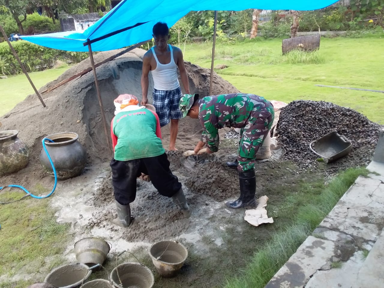 Contohnya, saat Serma Nurkhamid membuat adonan cor beton (pasir, split dan semen) dengan warga desa yang juga ikut membantu, keduanya tampak cocok dalam meramu adukkan cor beton untuk pemasangan sloof pondasi rumah. “Saya selalu meminta pertimbangan dengan tukang yang ada di Desa ini. Mereka pasti lebih berpengalaman dalam bidang pertukangan batu,” ungkap Serma Nurkhamid