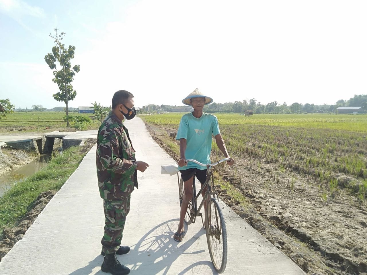 Saat tim Pendim Kodim Pati silahturahmi ke Desa Tamansari Minggu (18/07/2021) dan melihat dari dekat jalan beton yang telah dibangun di kegiatan TMMD, melihat langsung antara Babinsa Koramil 16/Jaken dan salah satu warga DesaTamansari Mbah Sobari (63) Yang baru hendak berangkat ke sawah.
