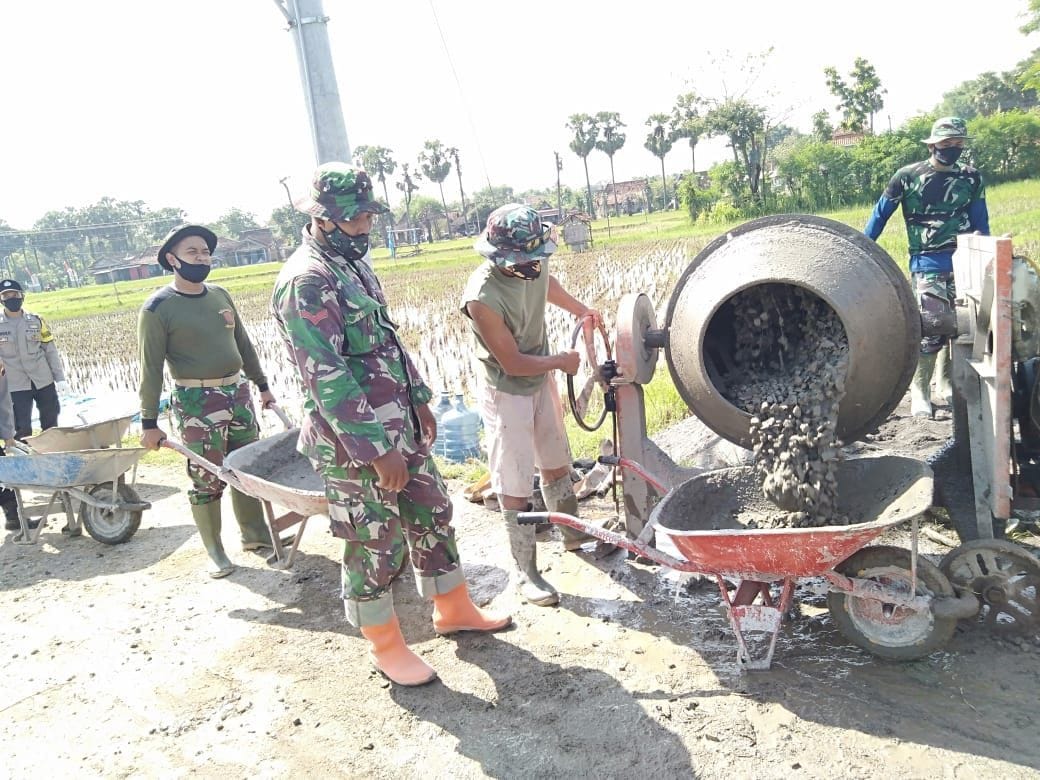 Para Satgas TMMD Reguler ke-111 Desa Tamansari selain ahli menembak, berperang, dan olahraga, juga handal mengaduk luluh atau cor-coran campuran adukan pasir dan semen sebagai bahan bangunan pengecoran