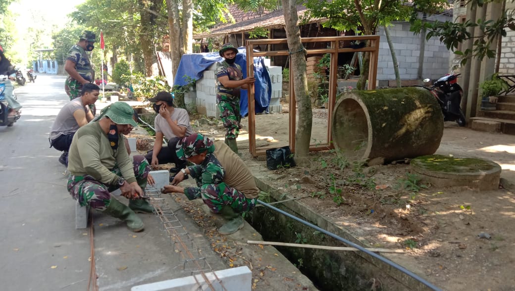 Pati – Anggota Satgas Tentara Manunggal Membangun Desa (TMMD) Reguler Ke-111 TA.2021 Kodim 0718/Pati, di Desa Tamansari bersama dengan anggota Polri merakit besi begel untuk dibuat kolom sloof yang akan digunakan untuk pengikat dinding Rumah Tidak Layak Huni (RTLH). Rabu (23/6/2021)