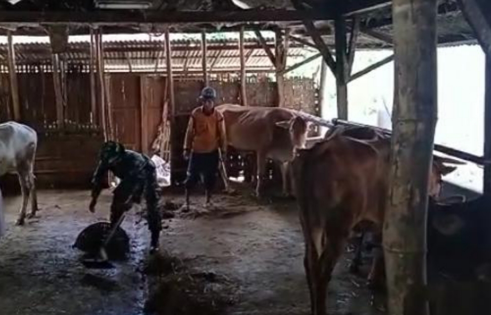 Pati – Sertu M. Toha salah satu anggota Satgas TNI Manunggal Membangun Desa (TMMD) Reguler ke-111 Kodim 0718/Pati, disela-sela waktu senggang dalam kesibukannya mengerjakan sasaran fisik TMMD, membantu Karmidi (58) warga Dukuh Pandahan, Desa Tamansari, Kecamatan Jaken, membersihkan kotoran ternak sapinya.
