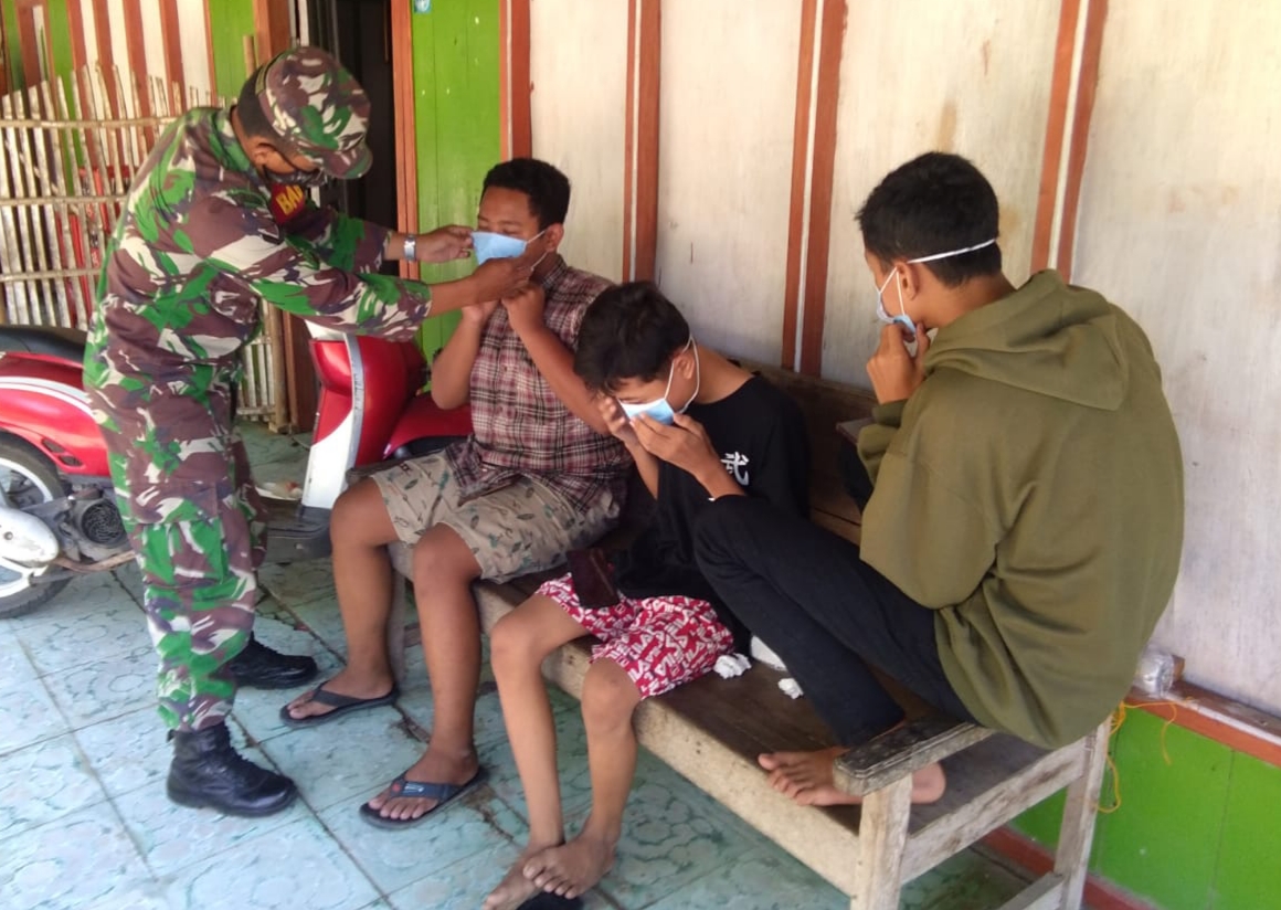 Seperti terlihat hari ini, Serda Irwanto anggota Satgas TMMD sedang membagikan masker gratis kepada sekelompok remaja yang kedapatan tidak memakai masker. Ia pun memberi himbauan kepada mereka untuk selalu mematuhi protokol kesehatan Covid-19 dalam melakukan aktivitas di luar rumah, Selasa (13/7/2021)