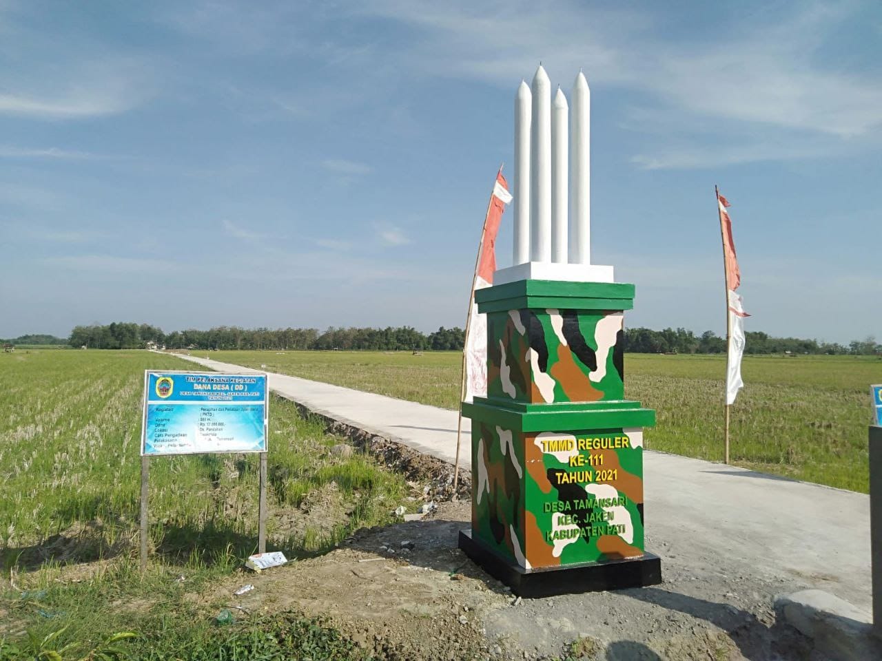 Sekian lamanya proses pengerjaan tugu prasasti TNI Manunggal Membangun Desa (TMMD) lokasi pembangunan di Desa Tamansari Kecamatan Jaken kabupaten Pati sudah selesai dibangun dan tampak begitu gagah perkasa.