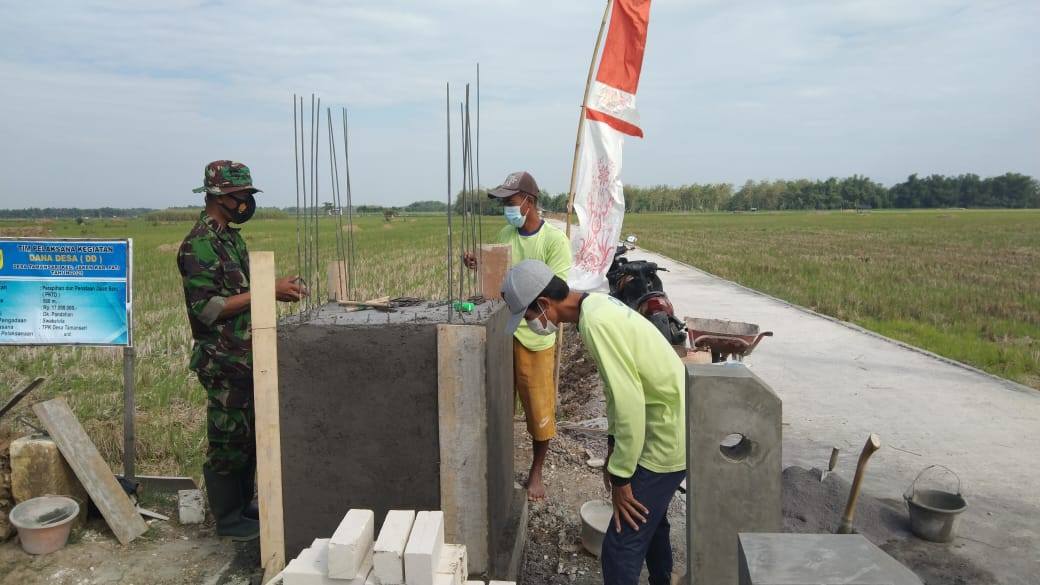 Pati – Satgas TNI Manunggal Membangun Desa (TMMD) Reguler ke-111 Kodim 0718/ Pati, terus mengerjakan tugu prasasti lambang Kemanunggalan Satgas TMMD bersama warga Desa Tamansari,Kecamatan Jaken, Kabupaten Pat, Jawa Tengah.
