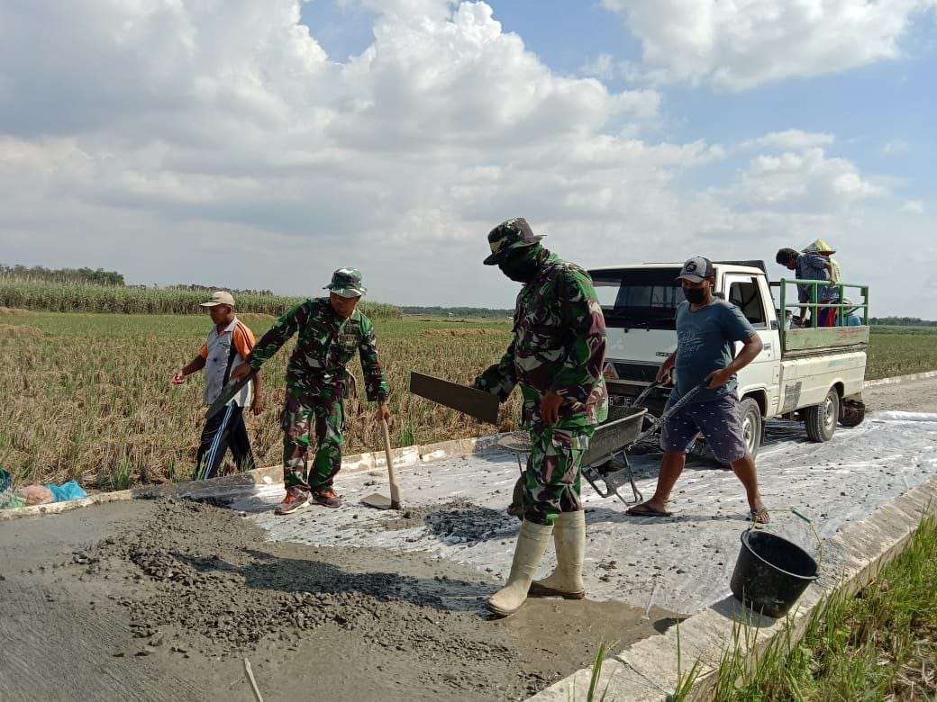 Pati – Pembangunan jalan beton 1.450 meter, lebar 2,6 meter, di Desa Tamansari, Kecamatan Jaken, Kabupaten Pati, Tinggal Separuh lagi ke ujung jalan sasaran Betonisasi, dalam pelaksanaan TMMD Reguler 111 Kodim 0718/Pati, Kamis (24/06/2021).