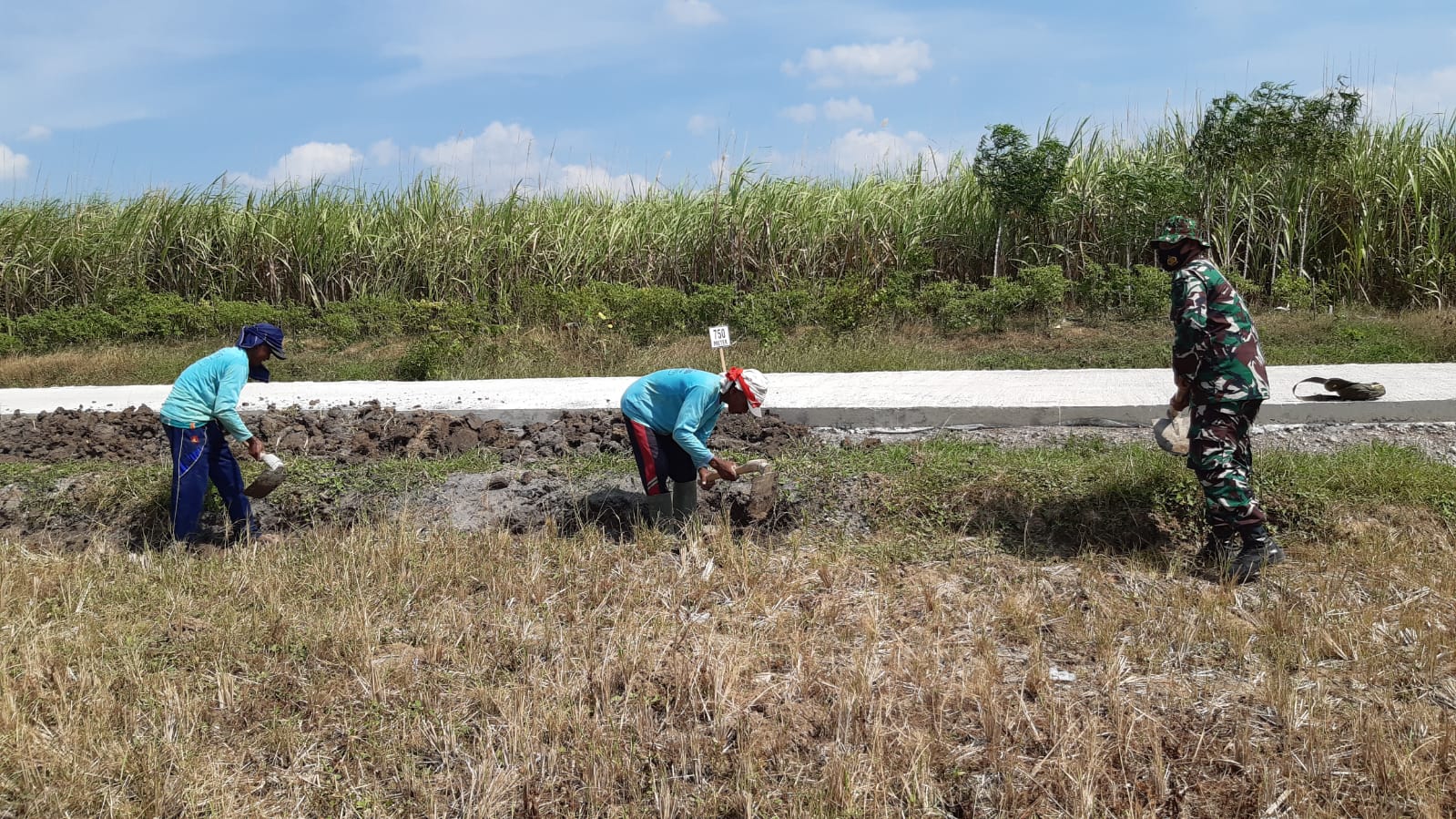 Tampak Sertu Kurdiyanto bersama warga desa menggali tanah persawahan untuk ditambahkan pada bagian bibir jalan atau biasa disebut berem. Dibantu warga desa meneruskan pekerjaan urugan tanah pada berem, dengan tujuan agar jalan rabat beton tidak timbul crak pada saat dilintasi kendaraan truk beban berat.