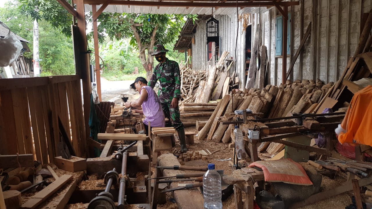 Seperti yang dilakukan Serka Joko Istanto yang memanfaatkan waktu istirahatnya untuk komsos dengan Darno (45), warga Dukuh Kemiri Desa Tamansari yang menekuni usaha bubut kayu yang sudah lama di tekuninya. Anggota satgas yang bersilaturahmi pun ingin tahu lebih jauh tentang fungsi dari masin bubut kayu.