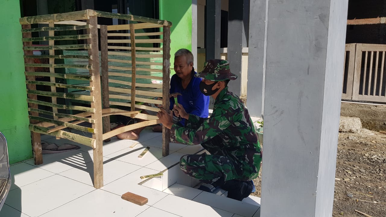 Pati – Satgas TMMD Reguler ke 111 Kodim 0718/Pati disela istirahat pekerjaan selalu menyempatkan diri untuk melaksanakan komsos. Seperti yang dilakukan Serda Fajarianto sedang menyambangi salah satu warga yang sedang membuat kandang ayam Bangkok pesanan dari pembeli. Warga tersebut adalah Efendi (53) warga Dukuh Pandahan RT.02/03, Desa Tamansari, Kecamatan Jaken, Kabupaten Pati yang menekuni jasa pembuatan kandang ayam Bangkok sudah digeluti selama dua tahun, Rabu (07/07/2021).