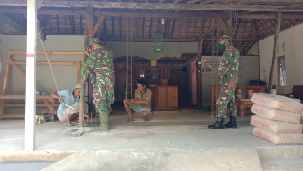 Anggota Satgas TMMD 111 bersama warga masyarakat Desa Tamansari sedang mengerjakan pemasangan rangkaian besi kolom sebagai penahan dinding bagian dalam rumah milik Sukardi (64) salah satu warga yang menerima bantuan rehab RTLH.
