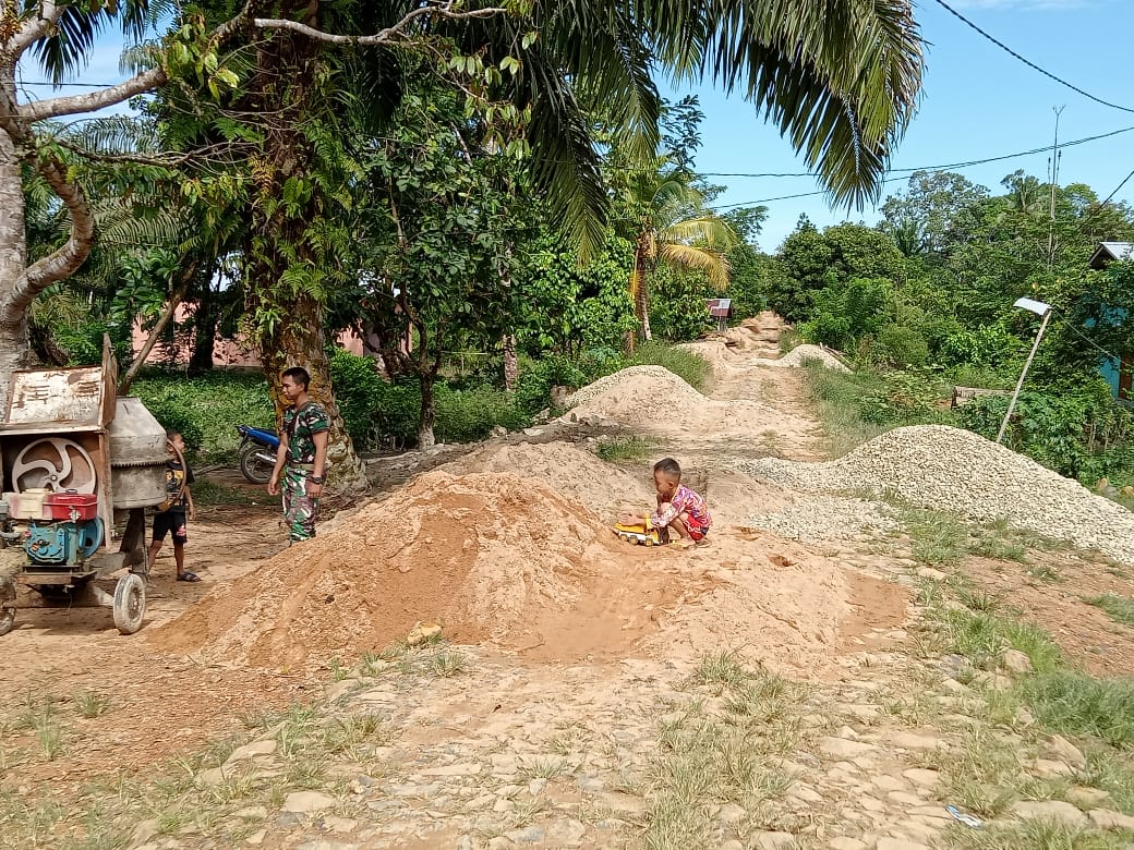 Anak-anak Desa sentangau jaya di lokasi TMMD penyimpanan material pasir bermain mobil-mobilan dan memainkan alat molen, Kehadiran anak-anak tersebut saat bermain di awasi oleh personil Satgas TMMD yaitu Serda Andika.
