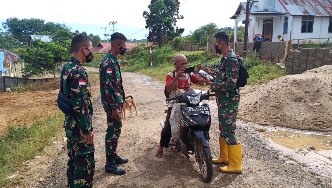 BENGKAYANG – Kegiatan TMMD ke 111 Kodim 1202/Singkawang saat ini memang berjalan di tengah Pandemi COVID-19. Di sela kegiatan Anggota Satgas TMMD 111 Kodim Singkawang Serda Stefelik Endry membagikan masker dan memberi himbuan kepada warga desa Ngrancang.