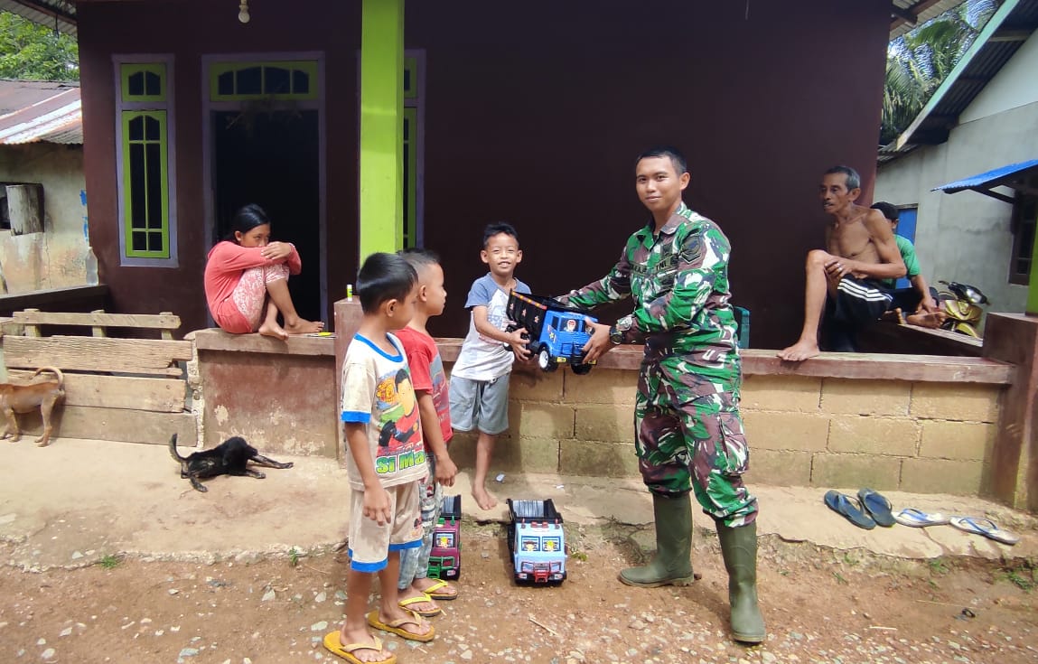 Bersama anak-anak di Desa ini, Serda Dhika Arminia memberikan anak-anak mainan baru kemudian mengajak anak-anak itu bermain.