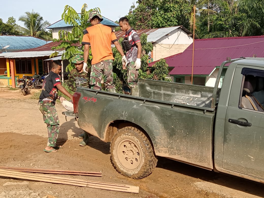 terlihat beberapa anggota satgas TMMD saling bahu-membahu dan bersemangat, Itulah moment tepat untuk mengirim material dengan mobil dan sedang menurunkan semen dari kendaraan dinas pickup milik Kodim.