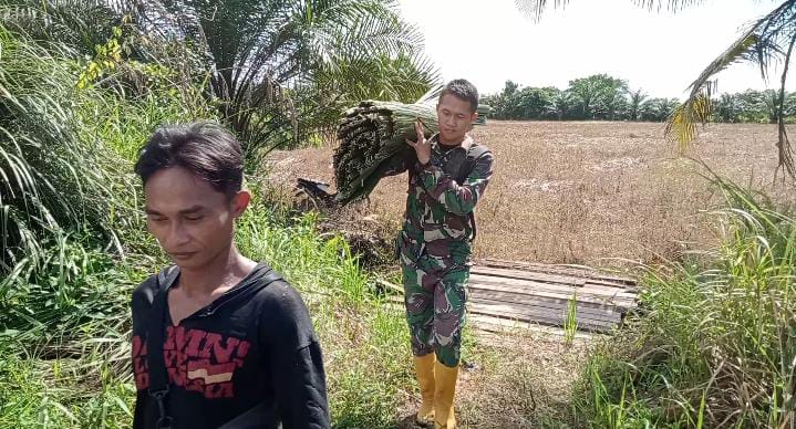 Salah satu prajurit Satgas TMMD disela-sela kegiatan menyempatkan diri untuk membantu kegiatan warga Di Desa Sentangau Jaya seperti membantu menganyam atap dari Daun Sagu.