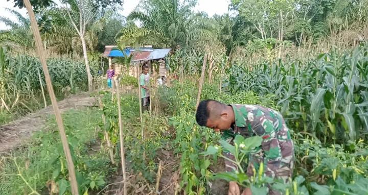 terlihat saat anggota Satgas TMMD, Prada Junaidi bersama bapak Somad, sedang melaksanakan panen cabai hasil kebun sendiri di lahan pribadi yang dimiliki nya.