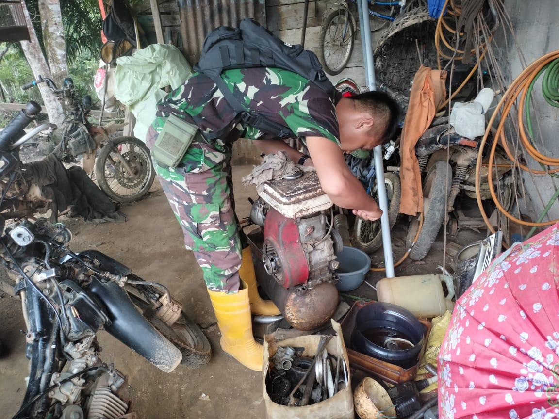 Seperti yang dilakukan, Serda Stefelik Endri, salah satu Anggota Personil Satgas TMMD ke -111 Kodim 1202/Skw membantu warga sedang memperbaiki mesin penyedot air yang sudah rusak.