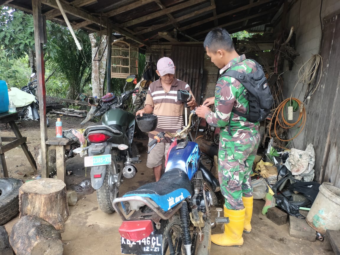 “Sepeda motor Sukirman warga Desa Sentangau Jaya ada yang rusak. Kebetulan saya mempunyai keahlian bengkel sedikit, sehinnga saya bisa membantu memperbaiki sepeda motor tersebut,” kata Serda Alvonsius.