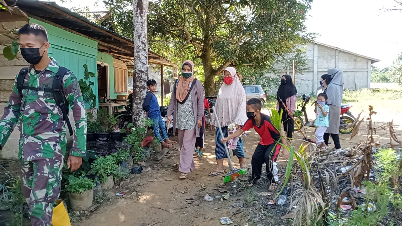 Warga desa bersama anggota Satgas TMMD ke-111 Kodim 1202/Skw membersihkan lingkungan di lokasi TMMD, ada yang menyapu, ada yang membersihkan dan membuang sampah.