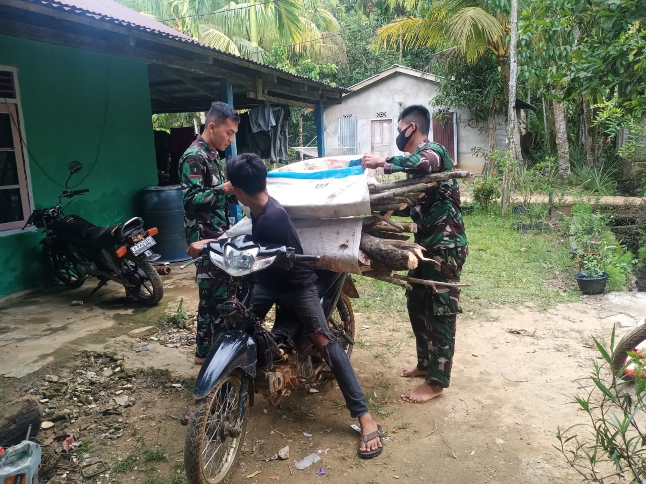 Hal itu terlihat saat, Anggota Satgas TMMD Ke-111 Kodim 1202/Skw membantu Pak Bayu (30), warga Dusun Trimulya Desa Sentangau Jaya Jalan Trans Segorong Kecamatan Seluas Kab Bengkayang menurunkan kayu dari atas motor nya.