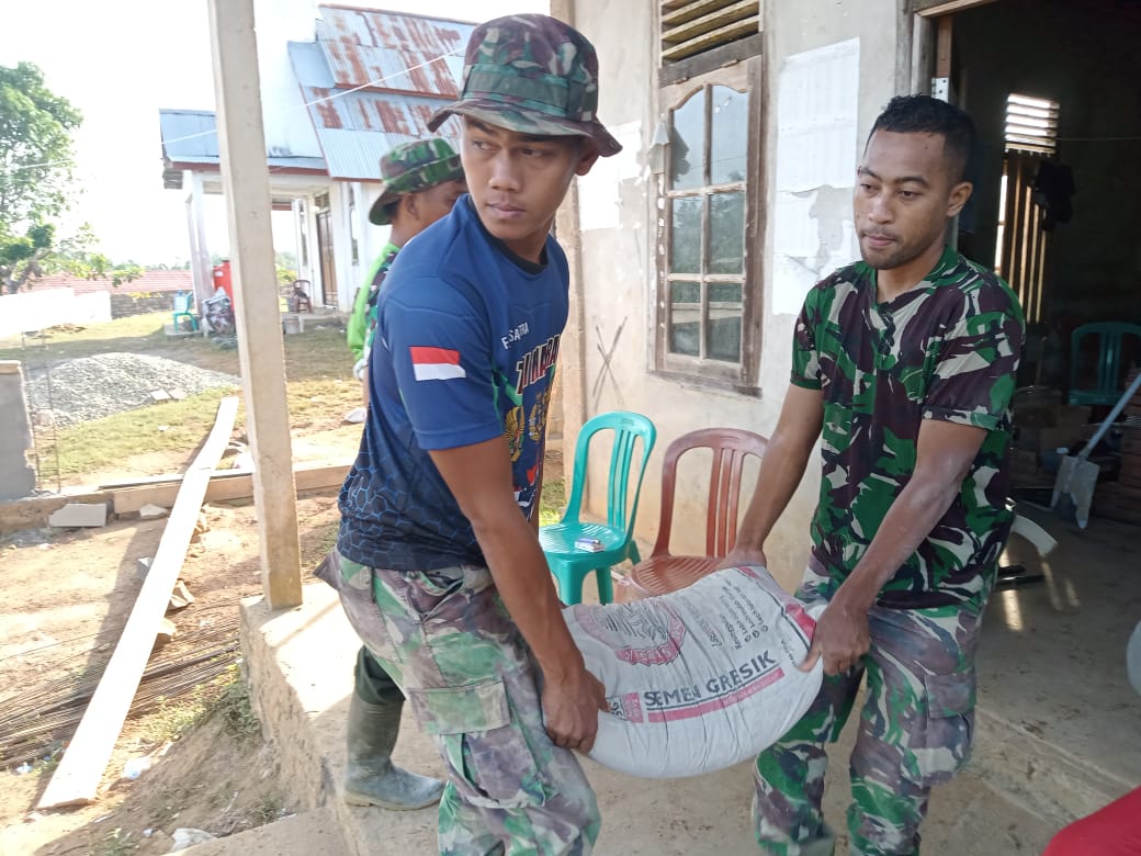 ini terlihat ketika anggota TNI yang Semangat sedang Angkut semen dari Gudang , untuk kemudian didekatkannya ke mesin molen sebagai bahan utama dari pembuatan adukan beton.