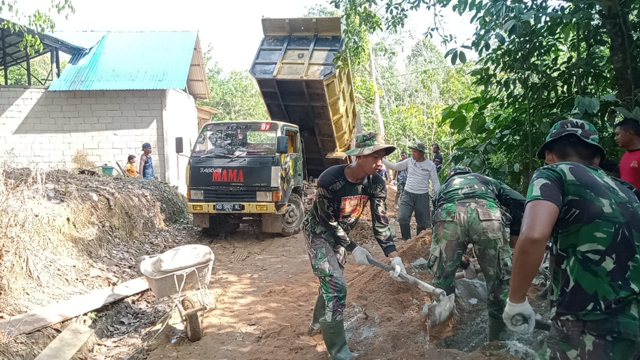 “Pengerjaan jalan penghubung terus digenjot agar selesai tepat waktu sebelum penutupan,” Ungkap Pasiter Kodim 1202/Singkawang Kapten Inf Sarmin. (Pendim 1202/Skw).