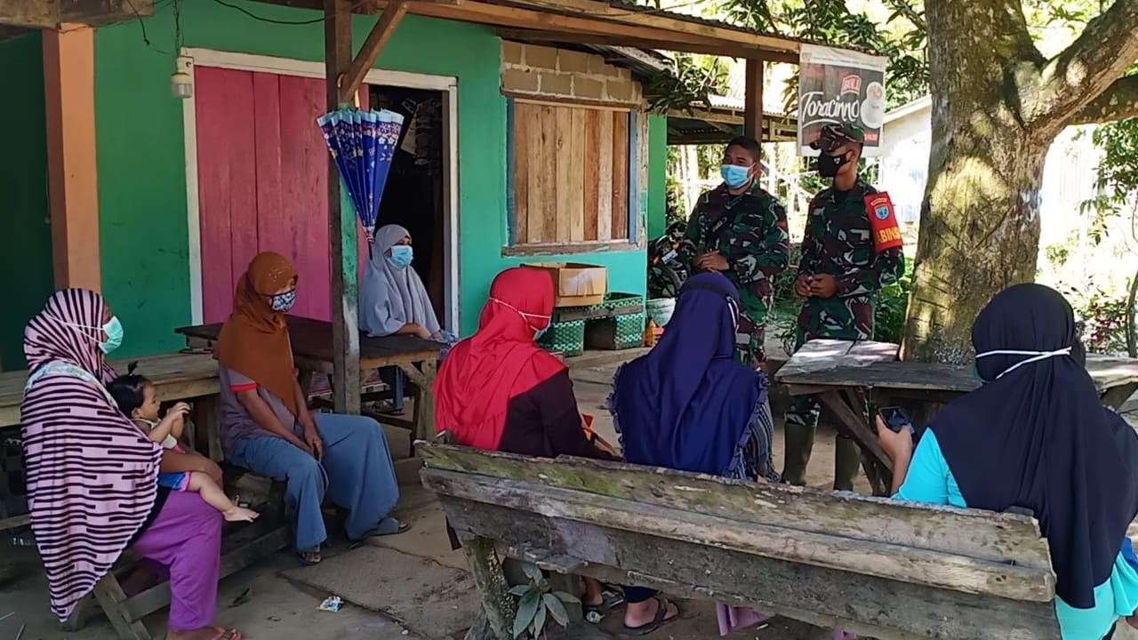 Seperti yang dilakukan oleh Serda Yeremia dan pratu Hendy, dengan mendatangi ibu-ibu yang sedang duduk di depan rumah, memberikan himbauan dan solusi dalam menghadapi masa pandemi COVID-19 yang sampai sekarang masih berlanjut.