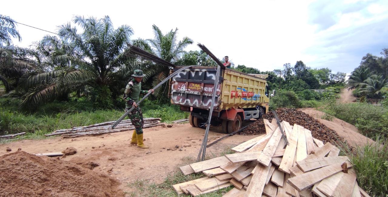 Bengkayang – Satgas TNI Manunggal Membangun Desa (TMMD) Reguler Ke-111 Kodim 1202/Skw bersama-sama menurunkan kerangka sasaran di Desa Sentangau Jaya Kecamatan Seluas Kabupaten Bengkayang.