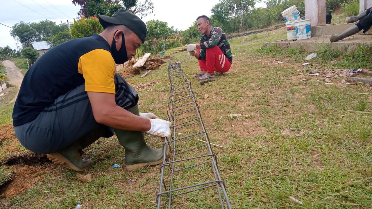 Bengkayang – Satgas TNI Manunggal Membangun Desa (TMMD) Ke-111 Kodim 1202/Skw bersama warga melaksanakan pembuatan rangka tiang besi cor untuk gereja ST Kristoforus di Desa Sentangau Jaya Kecamatan Seluas Kabupaten Bengkayang.
