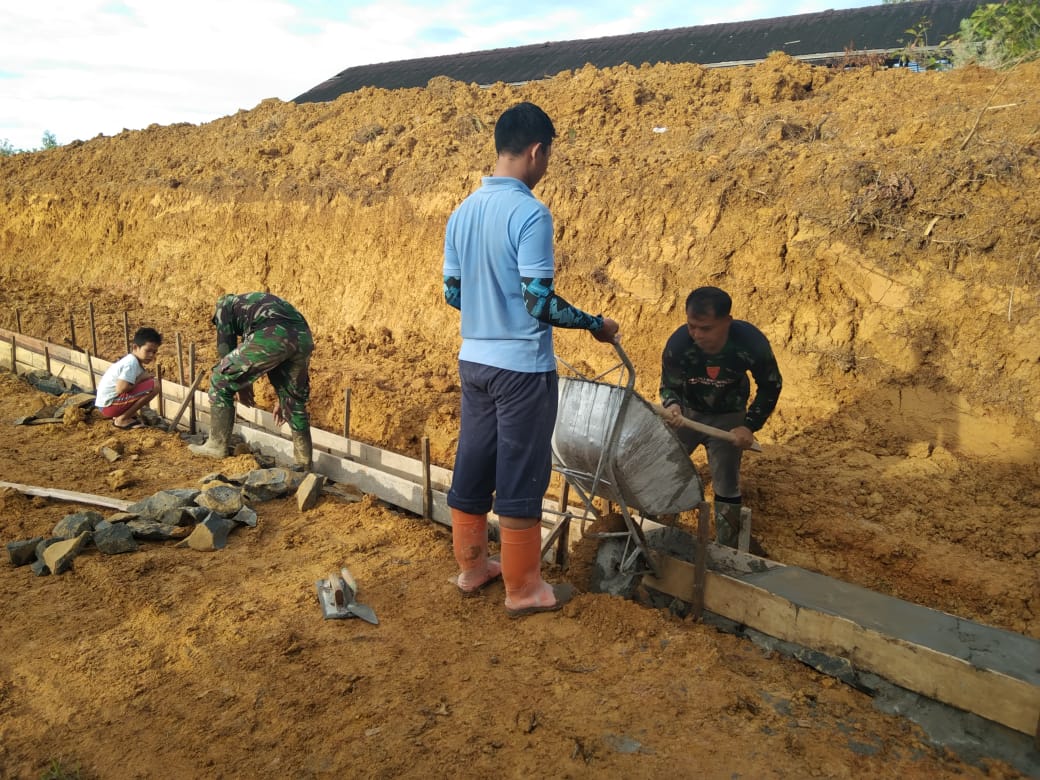 Bengkayang – Satgas TMMD Ke -111 Kodim 1202/Skw di Desa Sentangau Jaya, Kecamatan Seluas Kabupaten Bengkayang, melanjutkan pengerjaan pagar bagian belakang Gereja ST Kristoforus.