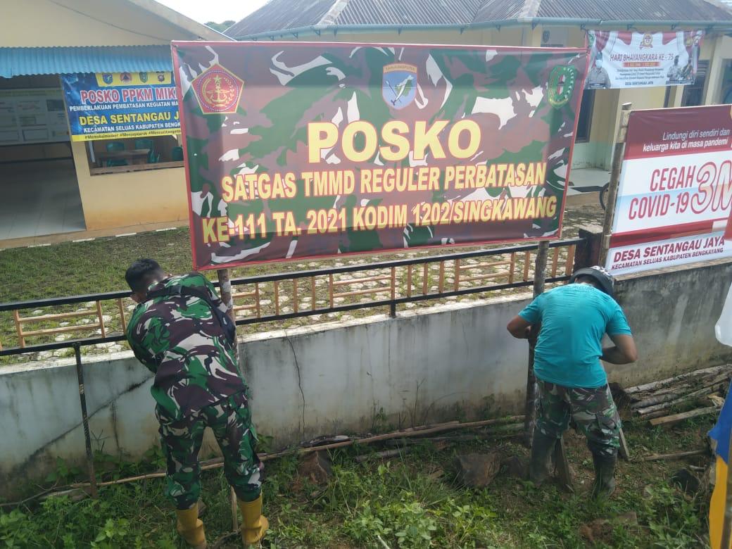 Bengkayang – untuk menunjang pelaksanaan program TMMD ke-111 Kodim 1202/skw di Desa sentangau jaya kec. seluas kab. bengkayang Tumanggal Kecamatan Pengadegan, anggota Satgas TMMD salah satunya Serda Galuh bersama kades sentangau jaya, memasang banner Posko TMMD yang dipusatkan di aula desa.