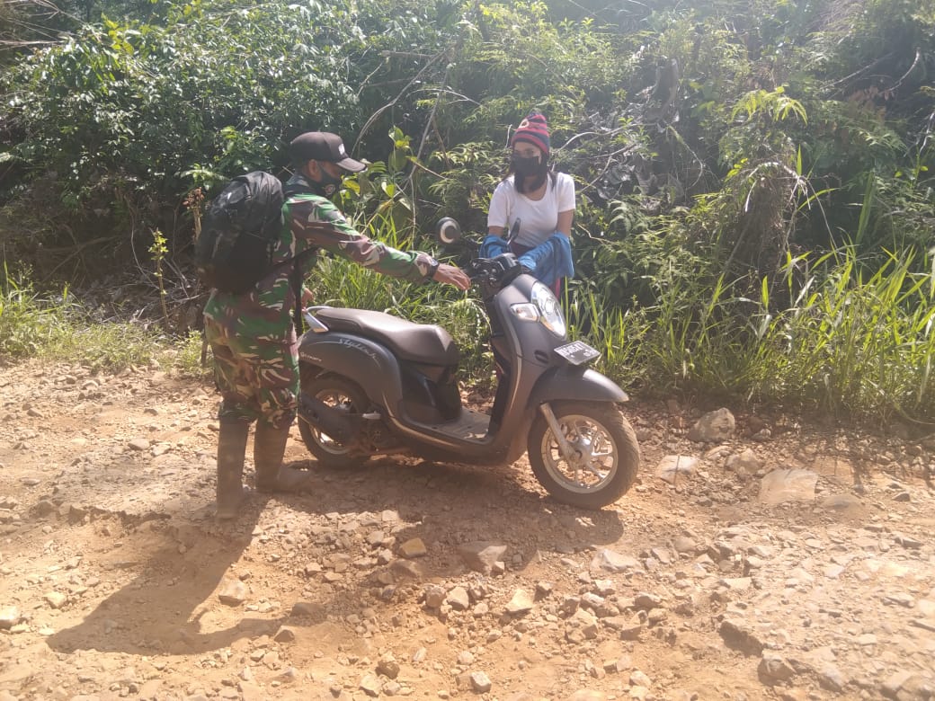 BENGKAYANG – Personil Satgas TMMD 111/ Kodim 1202 Singkawang, Praka Alfonsus Sihotang membantu warga Dusun Bukit Sangge Desa Sentangau Jaya, Kecamatan Seluas, Kabupaten Bengkayang yang motornya sedang mogok di tepi jalan. Rabu (16/06/2021)