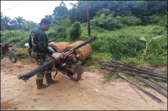 Bengkayang- anggota satgas TMMD Ke-111 kodim 1202/SKW angkut material besi menggunakan sepeda motor untuk mempercepat penggangkutan untuk bahan pengecoran pembangunan jembatan ukuran 3×4 M. Jum’at (18/06/2021)